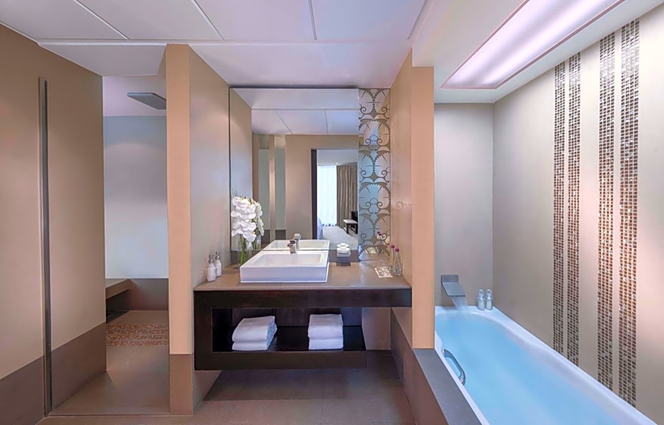 A magnificent suite located in the south building with a spacious bathroom and a walk-in shower. Separate living and dining areas are available, featuring a large executive desk with essential business tools an electronic mirror TV in the bathrooms.
